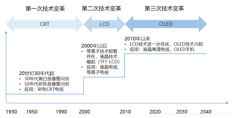 上个世纪 CRT 电视的发明,引领了显示技术的第一次革命,电视从此走进千家万户的日常生活;第二次显示技术变革,LCD 成为显示行业的主力军,并把应用范围进一步扩到了 PAD、手机等各种手持设备;第三次变革是2010年后有机发光二极管(OLED)技术兴起,为柔性屏、折叠屏、卷曲屏等异型屏形态创新提供了最核心的技术支撑。目前正处于 LCD 和 OLED 两种主流显示技术交织并存的阶段。