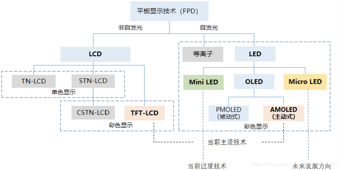从技术分类来看,显示技术分为非自发光 LCD 和自发光 LED 两大体系,当下最为主流的细分技术是 TFT-LCD 和 AMOLED,未来演进技术为 Micro LED,过渡技术为 Mini LED。